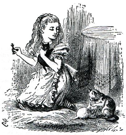 — Ах ти, шкода така! — скрикнула Аліса і, спіймавши кошеня, поцілувала його. Цим вона хотіла показати, що кошеня потрапило в неласку. — Справді, Діна не навчила тебе розуму! Треба було вчити, Діно, треба було! — додала Аліса, намагаючись говорити сердитим голосом, і з докором подивилася на стару кішку.