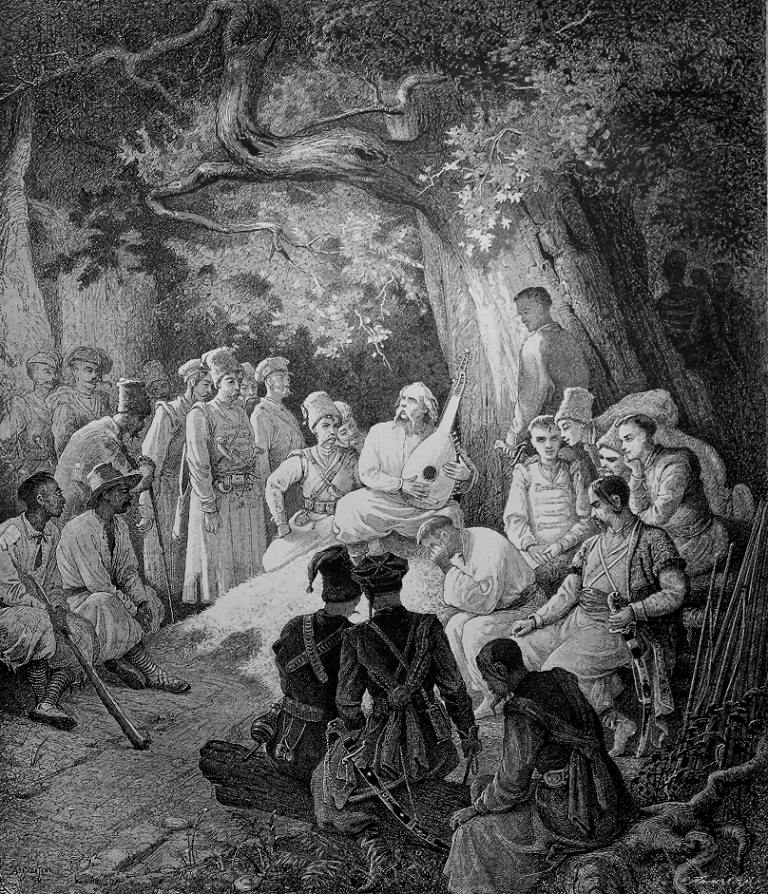 Начнем же уже начало книги сице: весело подивиться на сліпого кобзаря, як він сидить собі з хлопцем, сліпий, під тином, і весело послухать його, як він заспіває думу про те, що давно діялось, як боролися ляхи з козаками; весело… а все-таки скажеш: «Слава Богу, що минуло», — а надто як згадаєш, що ми одної матері діти, що всі ми слав’яне. Серце болить, а розказувать треба; нехай бачать сини і внуки, що батьки їх помилялись, нехай братаються знову з своїми ворогами. Нехай житом-пшеницею, як золотом, покрита, нерозмежованою останеться навіки од моря і до моря — слав’янська земля.